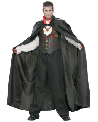 As this genteel ghoul, you’ll be the blood-sucking villain that lurks through the night. Costume features long, black cape with red collar, and 3D vest with bloody stake sticking out where heart would be. Now you’re ready to taste some Transylvanian blood, but it looks like your night may be cut short due to that wound. When did that happen?