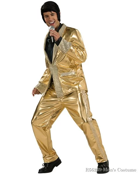 Gold lam? jacket and pants. Microphone and wig sold separately. Black shirt and shoes not included.