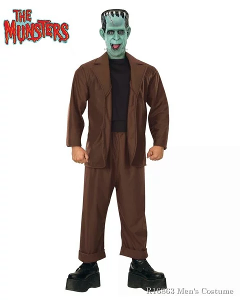 Become one of television’s favorite monsters when you get our Herman Munster Costume for Adults this Halloween. This costume comes with a half mask, jacket and pants that will turn you into the man of the haunted house in no time. The mask covers all but your mouth and comes in a washed-out shade of green. The costume’s forehead has a long scar in red and the mouth is upturned into a smile. Silver bolts jut out on either side of it in true Herman Munster form. The brown suit jacket is pretty simple. It features no buttons and has a turned-down lapel with an attached black shirt underneath. The brown suit pants have rolled cuffs just like Herman’s and match with the rest of the costume. Try it with a makeup kit to complete your face’s transformation or maybe some large platform shoes if you want to add height. Remember, Herman Munster was a BIG guy.