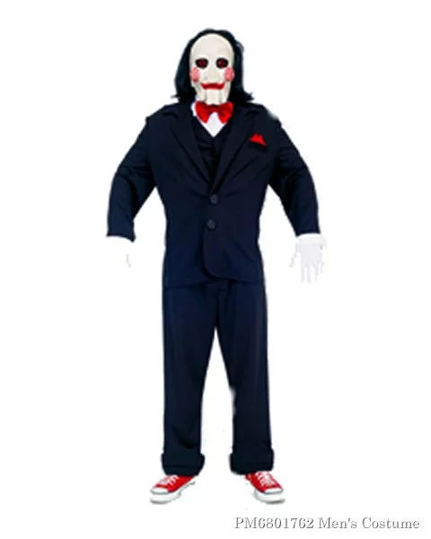 Bring that creepy puppet from the Saw movies to life with our Jigsaw Puppet Costume for adults. This is a simple, yet super creepy way to get dressed up this Halloween. The costume consists of a mask, jacket, pants, shirt and gloves. The mask is the first thing you’ll notice and it’s incredibly detailed. It looks just like the puppet’s head from the Saw films and even has faux hair! The suit jacket is a simple navy blue with two buttons and a red handkerchief in its breast pocket. Under that you’ll be wearing a white dress shirt with an attached red bow tie. The navy blue pants match the suit’s jacket and complete the body of the costume. White gloves are worn over your hands so there won’t be any human parts showing when you hit the town. Let’s play a game. It’s called order one of these before they’re all gone!