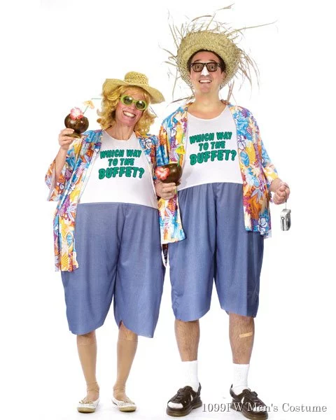 Every tropical resort has a couple like this. They are the tacky travelers with their loud floral shirts and Bermuda shorts. The Unisex Tacky Traveler Halloween costume features a jumpsuit with a hoop in the waist, and floral Hawaiian shirt. Across the chest it reads Which Way to the Buffet? This makes a great party costume for a fun-loving couple but works just as well alone. Add a few accessories such as a straw hat and sunglasses. Then add some stuff from home like black dress socks and sneaker or white gym socks and sandals, like shown. The Tacky Traveler costume will get loads of laughs and make your friends recall stories of their encounters with real-life tacky tourists.