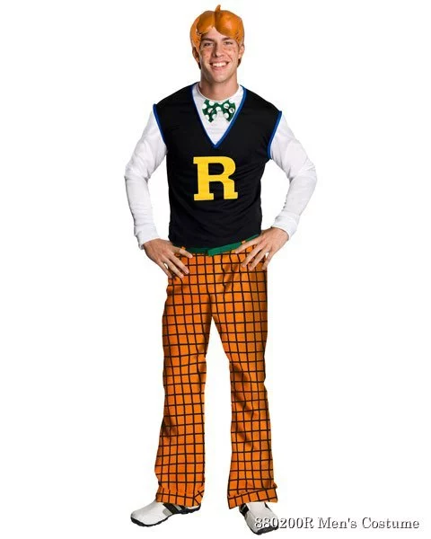 Let the Archie comic strip come to life as you experience teenage life at Riverdale high school in the Archie Comics Archie Men’s Costume. Archie is a red head who lives in Riverdale, and attends the local high school. Archie has many friends and has two steadies, Veronica and Betty. Archie is often portrayed as clumsy. You won’t look like a clumsy man in the Archie costume which features a white long sleeved shirt with attached polka dot bow tie. Attached to the shirt is a blue and green vest with a yellow “R” at the center. Included with the Archie costume is orange and black plaid pants. As a final touch, we include a carrot colored head piece. If you are attending a Halloween costume party with a friend, consider purchasing one of our other Archie comic inspired ensembles like the Jughead, Veronica and Betty costume.