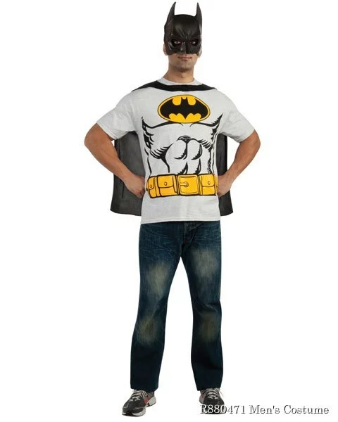 Keep Gotham City safe while looking super low key and stylish in the Batman Men’s Costume Kit. Bruce Wayne aka Batman was a regular guy who became a superhero when he witnessed the murder of his parents and vowed revenge. Using his money to build creative crime fighting gadgets, this superhero kept the city clean. This Halloween costume is a departure from the norm and doesn’t result in you looking silly in unyielding tights. This Batman ensemble includes a grey t-shirt with screen printed muscles across the chest and down the abdomen. At the top of the t-shirt is the black Batman logo. At the mid section of the shirt is a yellow printed utility belt. In addition to the muscled and Batman themed t-shirt, we also include a removable small black cape. To keep your identity a hush-hush, we provide a black mask so you can do your good deeds in secret.