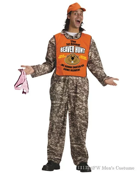 Get ready for the First Annual Beaver Hunt by wearing the Men’s Beaver Hunter costume for Halloween. This very humorous Halloween costume features a camouflage jumpsuit with a vest that says, 1st Annual Beaver Hunt. Load Up Your Pistol And Head To The Bush…We Gonna Snatch Us Some Beaver. Its just dirty enough for all your friends to get a good laugh over yet obscure enough that younger party goers won’t get the joke. The Beaver Hunter costume also includes the orange cap. This Halloween costume is from Fun World’s Lude and Crude Costume Collection and we know it will be a big hit at your next Halloween party.