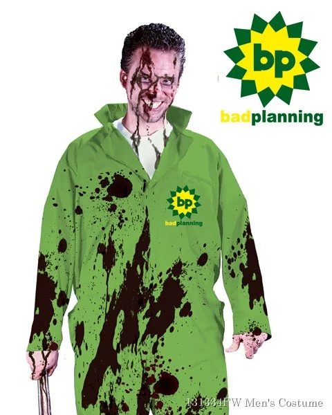 Make a political statement this Halloween in a humorous way to show your disgust for BP’s Bad Planning. The BP Bad Planning Adult Costume features a standard size green jumpsuit with the BP logo and the words Bad Planning under it. BP’s bad planning has resulted in the biggest oil spill in United States history. This is a controversial Halloween costume that you can wear to show people how you feel about the oil spill and the folks at BP whose “bad planning” led to this big mess. * Features a green oil stained jumpsuit with BP, Bad Planning Logo. * T-Shirt and wrench not included.