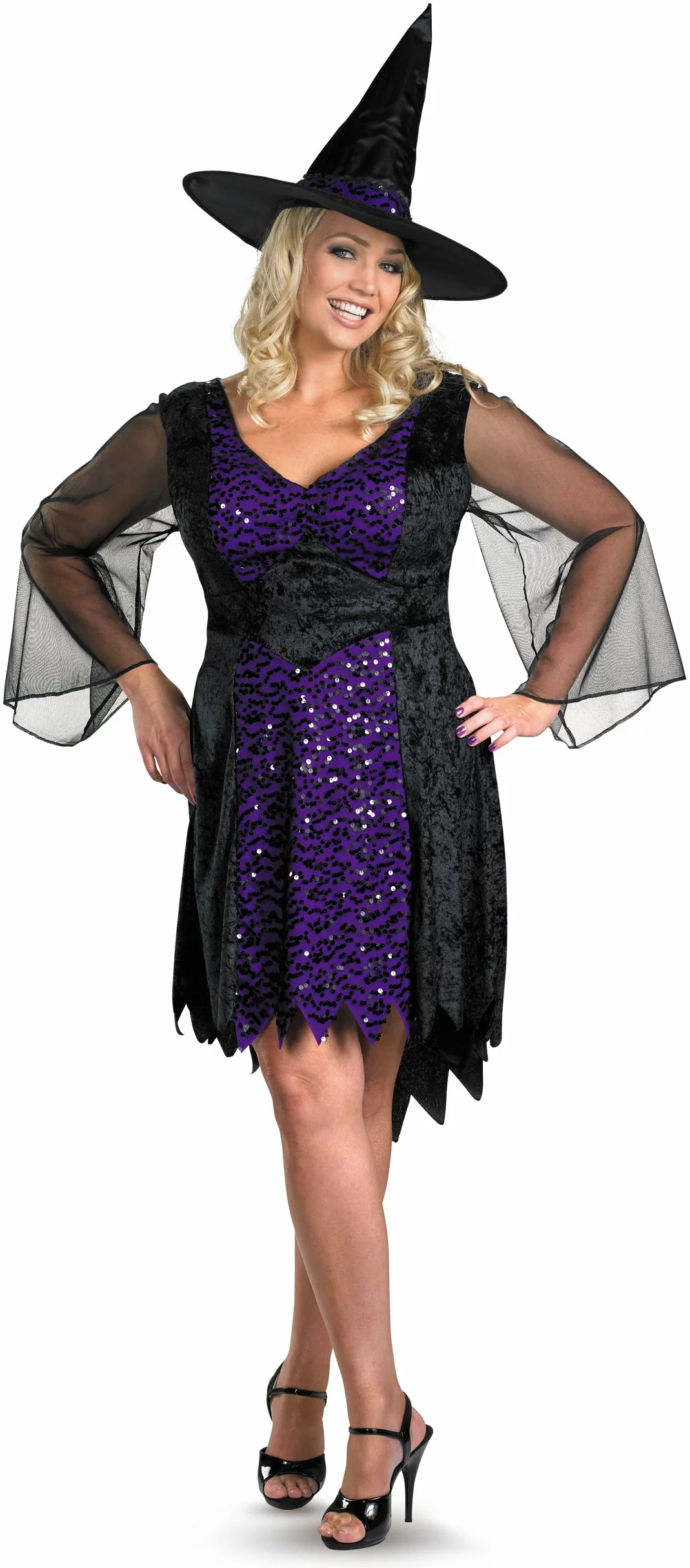 Have them all under your spell in the Brilliantly Bewitched Adult Plus Costume which includes: A faux velvet dress featuring black sequins down the center and a matching pointy witch hat.