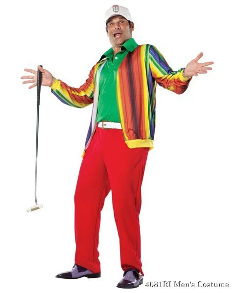 Be the most obnoxious member of Bushwood Country Club in the Caddyshack Al Cervik Adult Costume. Al is a wealthy real estate professional who has recently become a member at the Bushwood Country Club. Al is known for making high stakes bets since money is no object. You’ll look like this intolerable character in the Caddyshack Al ensemble that features a green polo style shirt with white buttons at the neck, red pants, an attached white belt and a jacket. The jacket has a front zipper enclosure and features a rainbow of vertical stripe colors. As a final touch to the Al Cervik Caddyshack costume we include a white hat with emblem. Consider purchasing gold inspired shoes and putter to create a realistic Al Cervik outfit. For those attending Halloween costume parties together, consider purchasing the Caddyshack Carl or Caddyshack Gopher costumes so you can attend as a themed pair.