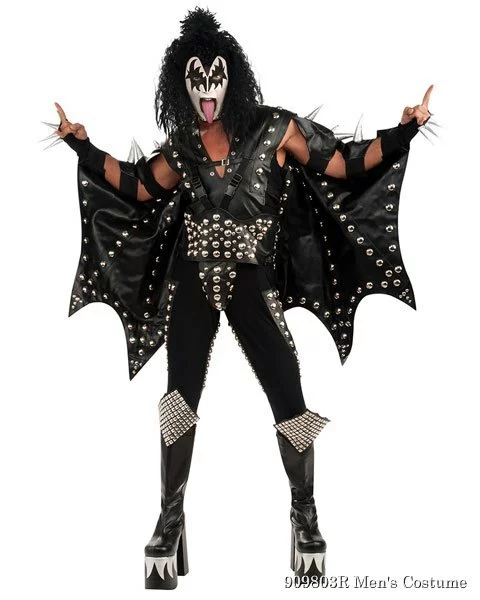 This is the most spectacular KISS costume available and a true member of the KISS army can wear this for Halloween, to perform on stage, or to be put on display as part of a KISS memorabilia collection. The Collector KISS Demon Mens Costume is an authentic version of Gene Simmons’ demon stage costume. The Demon collector’s costume features a black sleeveless jumpsuit with a black vest that has attached bat wings. With heavy silver stud embellishment on the vest, wings, and thighs, and big spikes down the length of the sleeves, this costume is fit for the demon god of rock. This men’s demon costume also includes a studded cod piece, a studded choker, black gloves with spikes, and the Gene Simmons KISS demon wig. True fans will want to apply their own KISS demon make-up but you can also add on a KISS mask for a foolproof look. Costumes do not include footwear.
