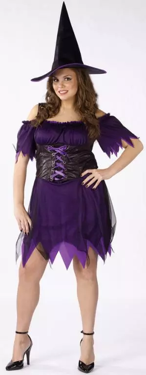 Costume includes: Purple, low cut, scalloped dress with black sheer layers, lace-up bodice look front and matching hat.