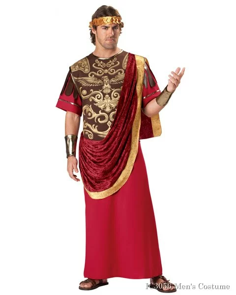 The head of the Holy Roman Empire would not stand for just any costume. He deserves a Deluxe costume for Halloween like the Men’s Deluxe Julius Caesar. This costume is made for the finest materials and is constructed meticulously so you have an outstanding costume that people will notice. The outfit includes a red robe with printed armor and an attached crushed velvet drape with gold trim. You also get the gold cuffs and the matching headpiece. If you don’t have a pair of sandals, we sell men’s sandals in our footwear section. See our suggested items below. This costume will be shipped to you on a hanger, in a zippered garment bag that has a photo insert of the costume so you know you are getting the outfit as pictured.