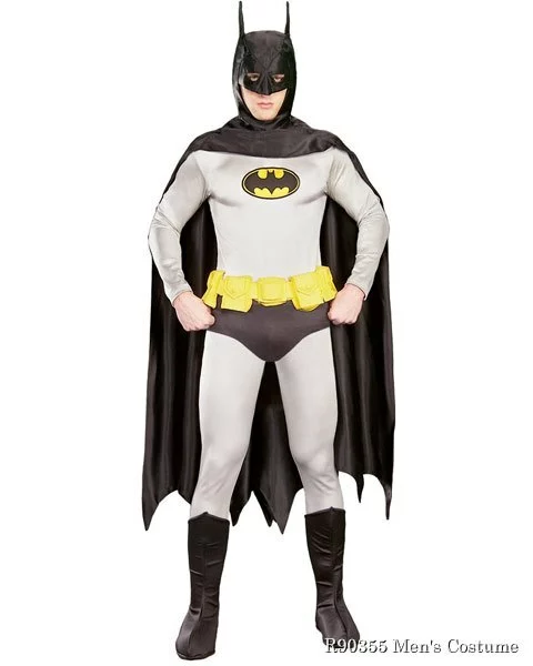 Batman is one of the most notable superhero crime fighters and Gotham City would be lost without him. This officially licensed costume is a deluxe ensemble that includes everything you need for the complete look of Bruce Wayne speeding through the streets in his Batmobile. The Deluxe Regency Batman Mens Costume comes with a long sleeve grey top with the classic Batman logo screenprinted on the front and a pair of matching slim grey pants that looks like a pair of black briefs over a pair of grey tights. The Regency Batman costume also includes a yellow molded latex belt, a pair of black boot tops, and the iconic Batman pointed hood headpiece with an attached black cape. Batman costumes make a strong statement on their own but can easily be paired with a friend dressed as his sidekick, Robin. Batman Halloween costumes are available in sizes that fit most adults up to size x-large.
