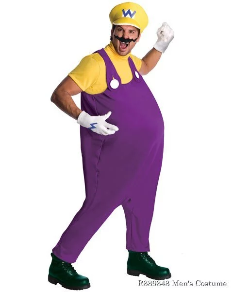 Be the arch nemesis of that famous mustached plumber and wreak havoc in the Deluxe Super Mario Wario Men’s Costume. Wario is the bad Mario in the many Wario video games of Super Mario. He is a muscular and silly version of Mario but is a villain. The Super Mario Wario costume features a purple overall jumpsuit with faux gold buttons. Attached to the overalls is a short sleeved yellow shirt. Included with the jumpsuit is an inflatable belly to give you that chubby look. Included with the Wario outfit is a plush yellow hat with a blue “W.” For Wario’s signature moustache, we include a squiggly faux moustache and white gloves with a blue “W” on each hand. If you are attending a Halloween costume party with a buddy or sibling, consider purchasing the Super Mario Waluigi costume so you can attend as a themed pair.
