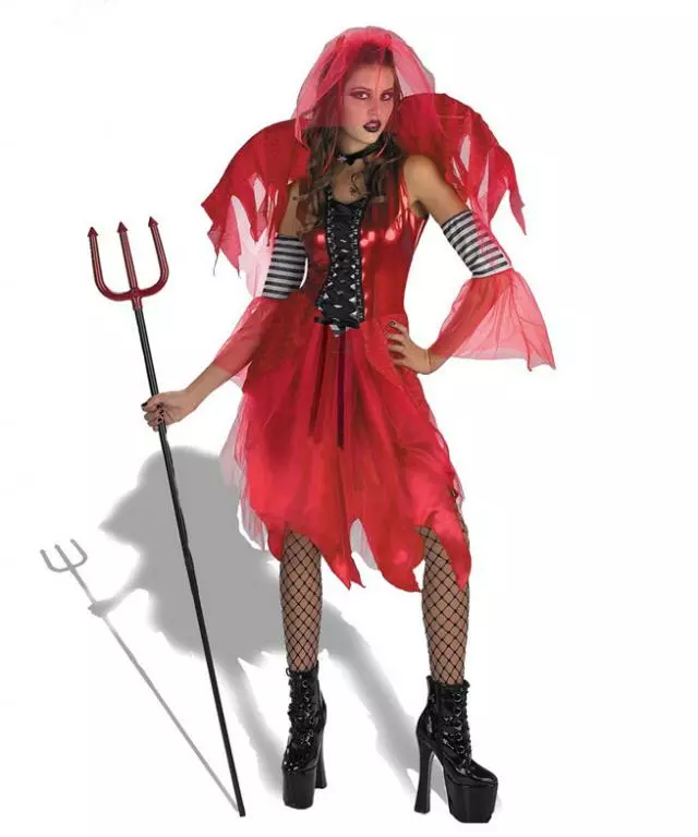 This is one wild demon!Includes: Dress with lace up front, jagged style bottom, wings, glovettes and devil horned headpiece with veil. Available sizes: