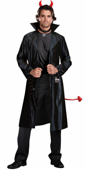 Give ’em hell this Halloween! The Devil Made Me Do It costume includes a vinyl trench coat with devil tail attached, neckband with silver studs and pentagram, and vinyl devil horns on a clear elastic band. Is it hott in here, or is it just him?