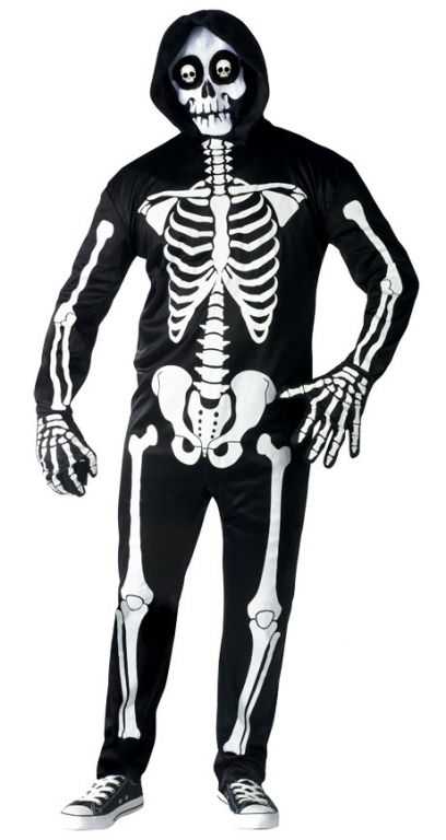 Costume includes: Bone print jumpsuit, hood with printed face, Color-change eyeball glasses, and bone-print gloves