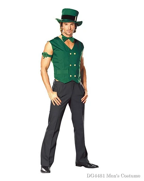 Some St. Patrick’s Day Costumes are silly, some are traditional and others are downright sexy. This Get Lucky Leprechaun Adult costume for men is the sexiest one we’ve seen for men yet. The Leprechaun costume features a green leprechaun hat with a black band and gold buckle, a double breasted green vest with gold buttons, a green bow tie and an armband with a 4 leaf clover. The pants are not included.