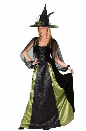 She’s an elegant witch with a little gothic twist. Create the same look this Halloween with the Goth Maiden Witch costume. Includes a long black and green dress with sheer sleeves and a black and green witch hat to match.