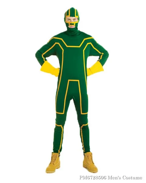 The Kick Ass costume is a great choice for the hip, young trend setters out there. If you have seen the movie you know its a pretty serious picture despite the funny looking costume. This adds the kitsch factor that will turn this movie as well as the costume into a cult classic. The Men’s Standard Kick Ass Costume features a green poly knit jumpsuit with yellow trim and a matching, detached mask. It also includes the yellow gloves. You can add assorted weapons if you choose. * Includes a poly knit printed jumpsuit, poly knit printed mask and poly knit gloves. * This is an officially licensed costume.