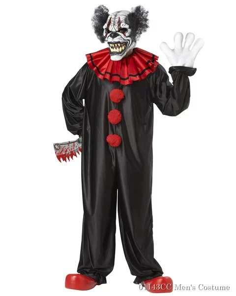 The Men’s Last Laugh The Clown is a sinister Halloween costume with something very special. In addition to being truly frightening at first glance, it has a mask that is equipped with Ani-Motion. This trademark line of costume masks work in unison with your own mouth and lips to move when you do, making it one of the most realistic masks you can wear without having to buy your costume at a Hollywood special effects house. The costume also includes a black jumpsuit with a red ruffle collar, red pom-poms, and jumbo white clown gloves. If someone you know is afraid of clowns, this Last Laugh costume will send them over the edge.