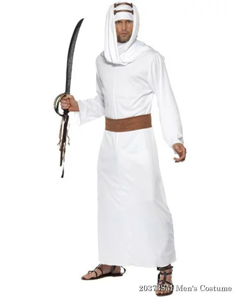 Chose which side to fight for, or fight for both in the Lawrence of Arabia Men’s Costume. In this movie Lawrence is a lieutenant in the British army who launches a guerilla war against the Turks. He recruits an army, mainly killers and cutthroats motivated by money, rather than the Arab cause. You’ll look like a Brit turned Arabian soldier in the Lawrence of Arabia costume which features a floor length long sleeved white tunic. To bring form to the tunic we provide a wide tan belt. As a final touch, we include a white headpiece with brown faux leather accents. To create a truly great Lawrence of Arabia costume, consider purchasing an Arabian inspired sword and strappy sandals. For those attending a Halloween costume party in a large group, consider purchasing multiples of this costume so you can go as a Arab inspired themed troop of soldiers.
