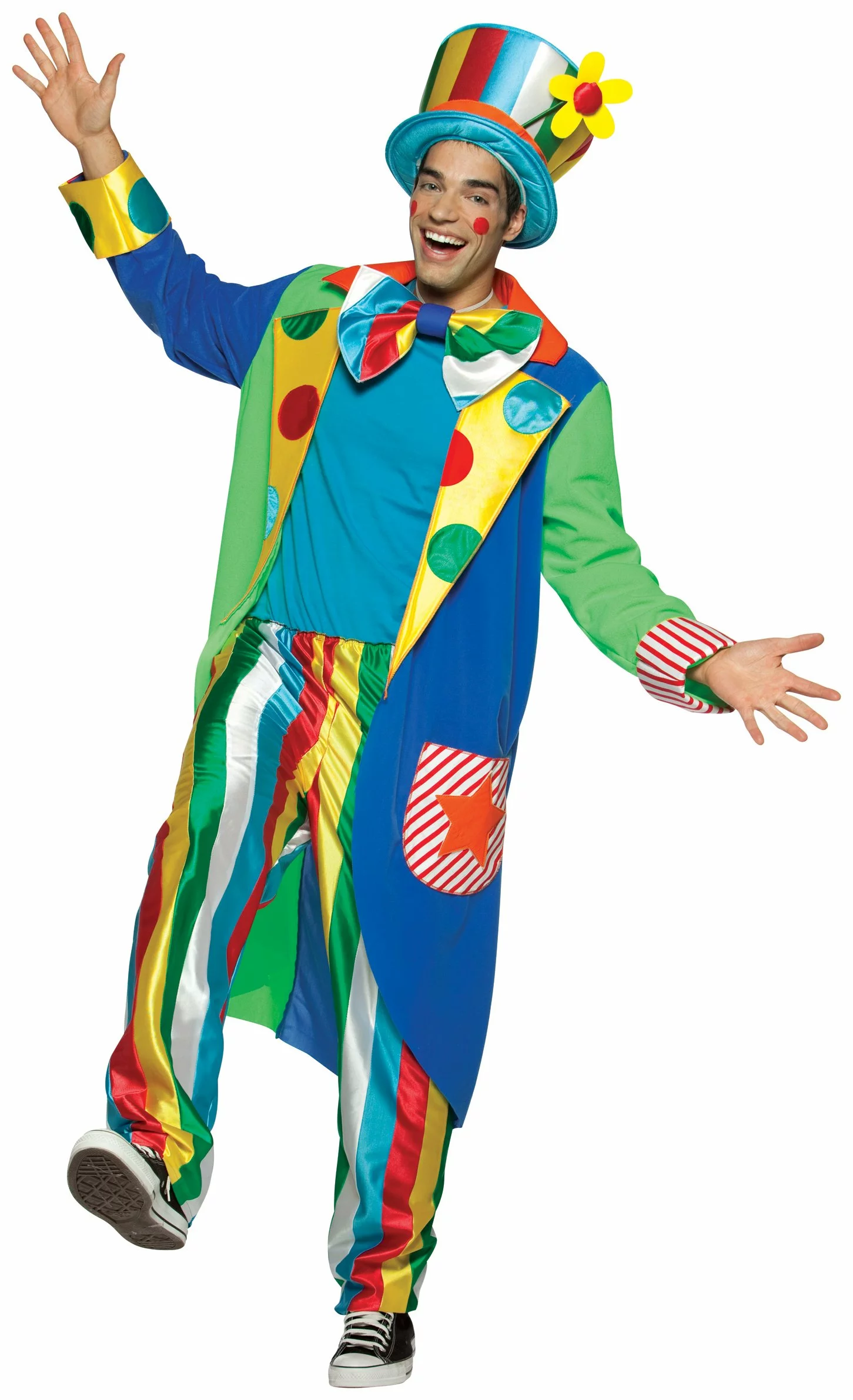 You can feel like a kid again in this timeless circus look. Sure to be a hit at birthday and Circus Costume parties alike! Includes a long, colorful clown coat with tails, a striped, colorful top hat, oversized bow tie and matching satiny pants. All for fun and fun for all!