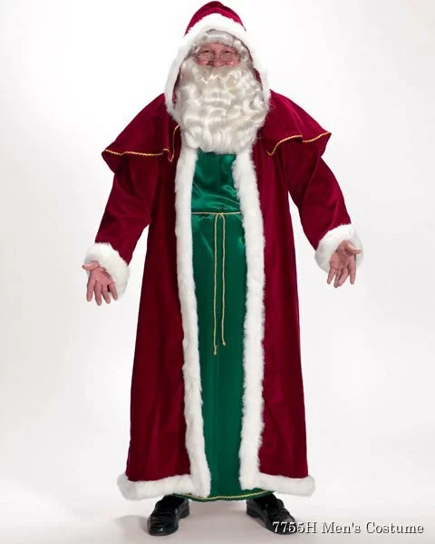 Not all Santa Suits are the same. This one harkens back to a time when the world was more simple and Christmas was more spiritual. The Men’s Victorian Santa Costume take us back to when Santa was St. Nick. This high quality costume features a robe and tunic rather than a jacket and pants. The robe is made of dark red velvet and is trimmed in white faux fur. It is also partially lined inside for quality and comfort. The robe has an attached hooded capelet that is trimmed in gold. The costume also included a deep green satin tunic, trimmed in gold and a gold rope belt. The glasses, wig, beard are sold separately. Standard size fits up to a men’s large. Shoes are not included.