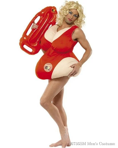 The Men’s Padded Baywatch Babe costume is an example of what happens when one of the Baywatch cast members lets themselves go. The show had been off the air for years and this Baywatch Babe has had one too many pints of ice cream. How dare she think she can still fit in her lifeguard uniform!! The Men’s Baywatch Babe costume is one of our several cross dressing costumes for men. It features the Baywatch red lifeguard swimsuit but it is padded with a saggy belly, bulging hips and sagging breasts. David Hasslehoff would be aghast. Accessorize your Men’s Baywatch Babe Padded costume with a variety of items like the ones we suggest here.