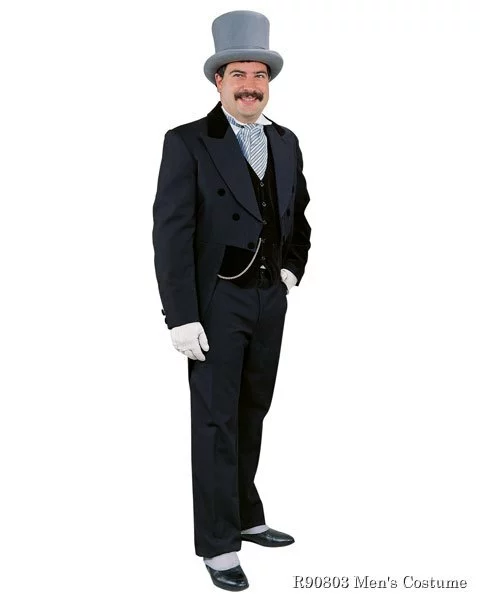 Waltz into the next Halloween costume party looking like the most regal and wealthiest man of them all in the Regency Collection Black Formal Tailsuit Men’s Costume. It is a fact, rich men dress only in the best. This Formal Tailsuit ensemble was created for the best and features black gabardine pants, a black velvet vest with center button detail and a black gabardine jacket. The jacket is short in the front with longer tails in the back and features a black velvet collar and black button details. This Formal Tailsuit ensemble gives you the basic black look, so you can accessorize as you choose. Be sure to check out our large collection of accessories to make this ensemble look like whatever you choose. By adding the right accessories, this costume is suitable for those who want to be a wealthy tycoon, magician, chauffeur, or groom for an upcoming Halloween costume party.