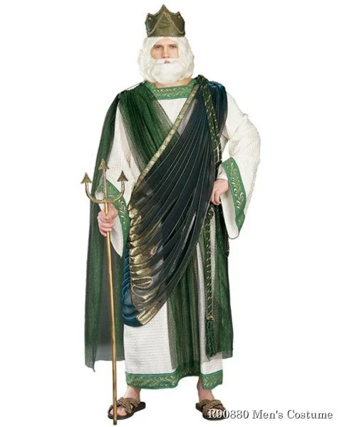 Control the raging sea in the Regency Collection Neptune Men’s Costume. In Roman mythology, Neptune was the god of water. The Roman people worshiped Neptune offering sacrifices and building temples hoping that he would provide them good fortune while out on the water. Romans will kneel at the site of you in the Neptune ensemble which features a white floor length tunic trimmed in green and gold pattern material at the neckline, sleeves and hemline. The tunic is adorned with multi-colored iridescent purple, blue, gold and green fabric drapes, giving you that regal look. As a final touch, we provide a dark gold colored crown headpiece. To make your Neptune Halloween costume sea god worthy, look through our accessories section. Consider purchasing a white beard, white wig, trident or Roman inspired sandals. We also offer many other Roman inspired gods for those attending costume parties together.