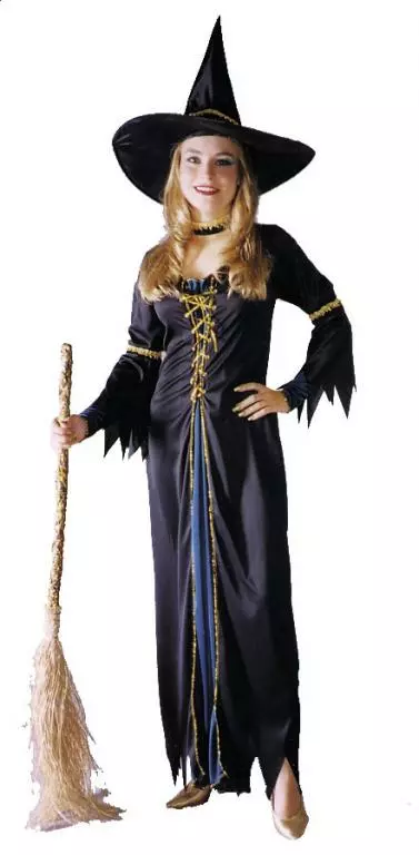 This Witch Is Always A HitCostume includes: Long black bewitching gown with lace-up bodice, flowing inset and zig-zag drape sleeves, gold trim sleevelets, gold armbands, gold choker and witch hat. Available size: