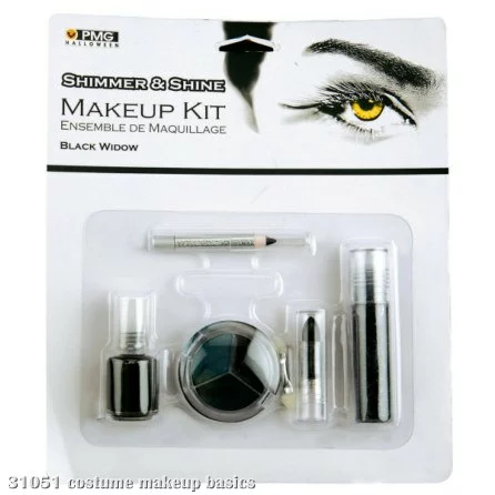 - 0.13 oz. makeup tray, 0.25 oz. glitter gel, one eyeliner pencil, black lipstick, black nail polish, and one makeup applicator.