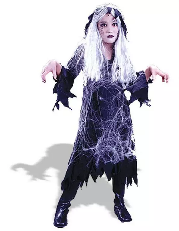 Crawl Your Way Through The Party!Costume includes: Ghost Wig, Hooded Gauze Coat, Dress with tattered edges and Spider Web detailing with plastic spiders.Available sizes: