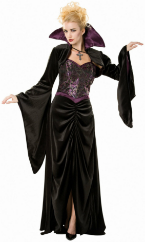 This sexy vampiress is the classiest dresser in this disguise. Costume features bolero style jacket with vampire crepe satin lined collar and attached gothic cross pendant, full length dress with brocade bodice and rouched cut away skirt. Now you’re ready for a night of blood-sucking fun. Watch your necks, boys, ’cause here she comes.