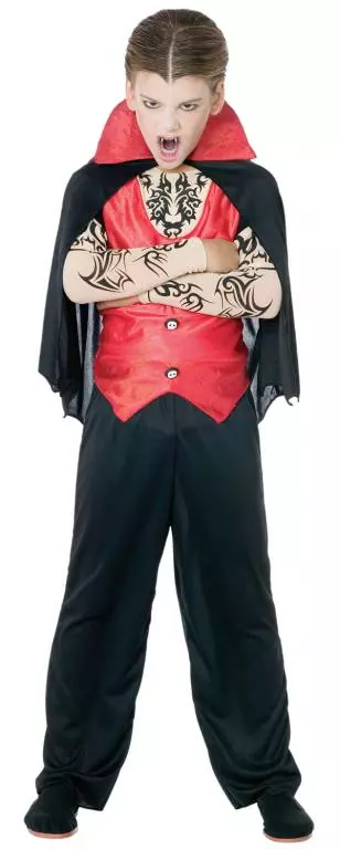 Costume includes: red vest with attached tattooed sleeves, chest front, vampire cape and matching black pants.