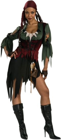 This diabolical diva’s disguise includes: A tattered peasant style dress featuring fuax wine corset, attached faux leather bag, fake teeth and miniature bones. A matching wine headscarf is also included in this shevil ensemble.