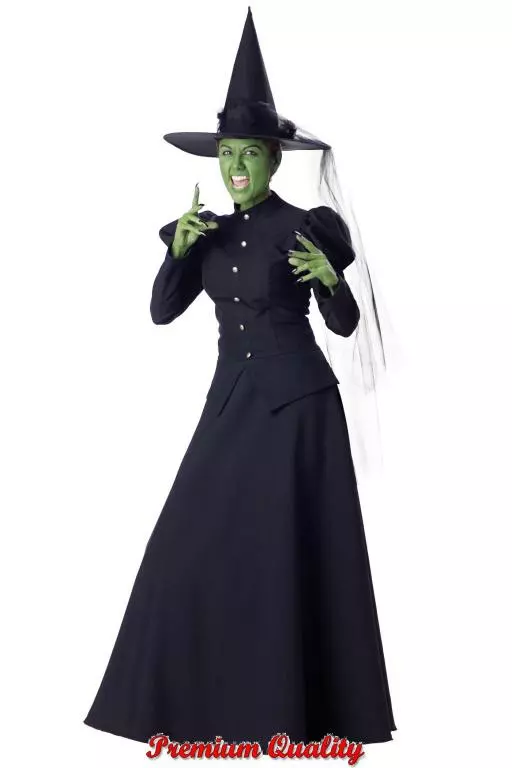This costumes includes a black gown, tulle petticoat, witch hat, tulle sash and stick on black fingernails.