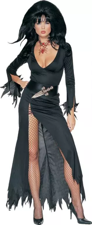Mistress Of The Night! Costume includes: Sexy long dress with low cut front and high cut bottom, dagger, and belt. Dress has jagged style edges around sleeves and hemline.