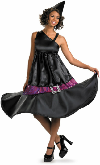 You’ll have them under your spell with this clever costume which includes: A darling dress with a witch hat silhouette featuring an iridescent organza overlay with attached faux rhinestone buckle along the base and a pointy black hat.