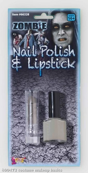 Complete your walking dead look! Includes one bottle of light colored nail polish and a tube of matching lipstick.